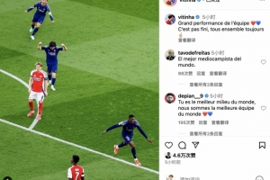 赛后,维蒂尼亚更新社交媒体写道:“球队高光时刻❤️💙征程未止,我们始终同心而行”