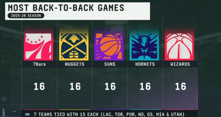 新赛季背靠背场次统计:76人掘金黄蜂魔术5队16场居首 勇士快船15场 湖人火箭14场